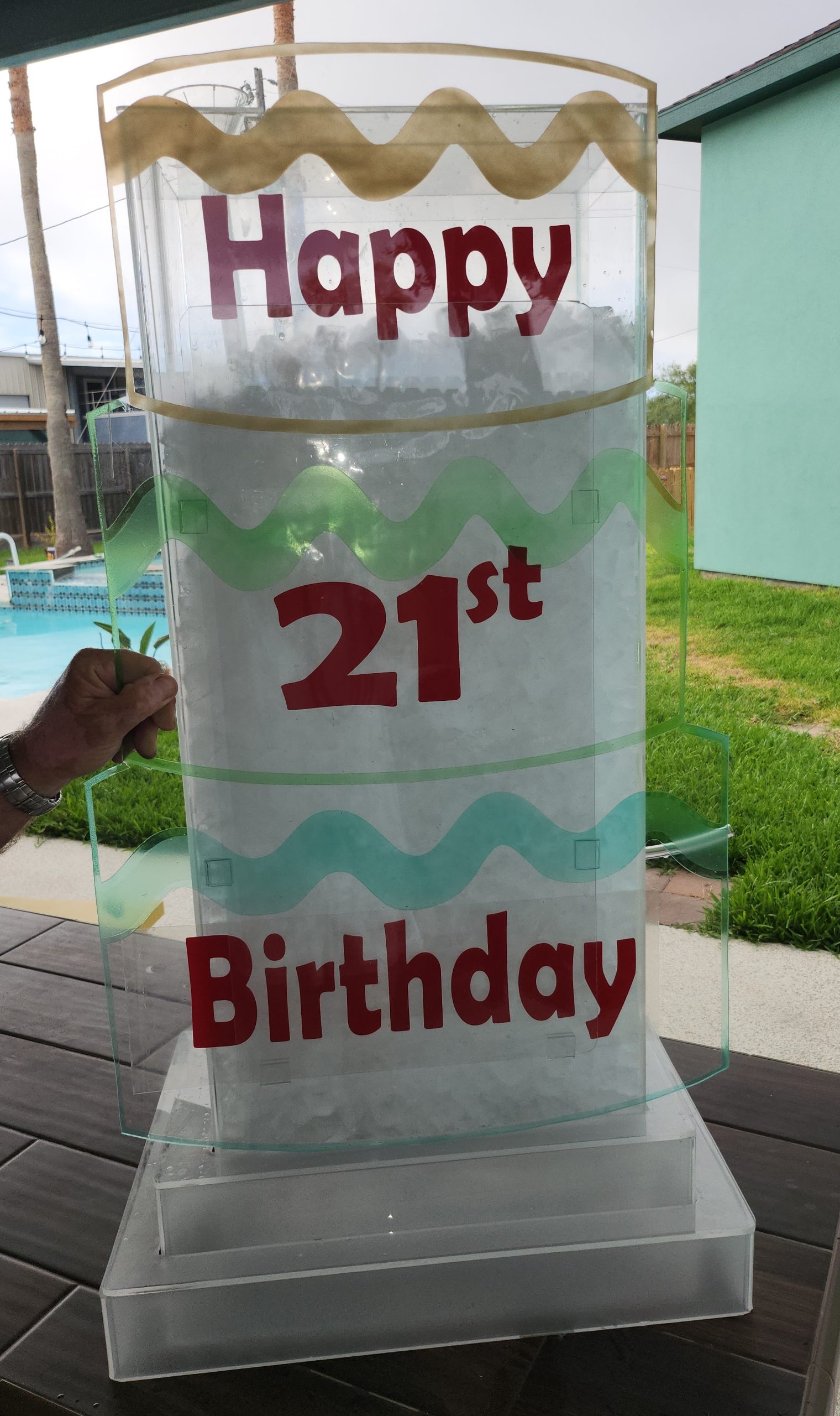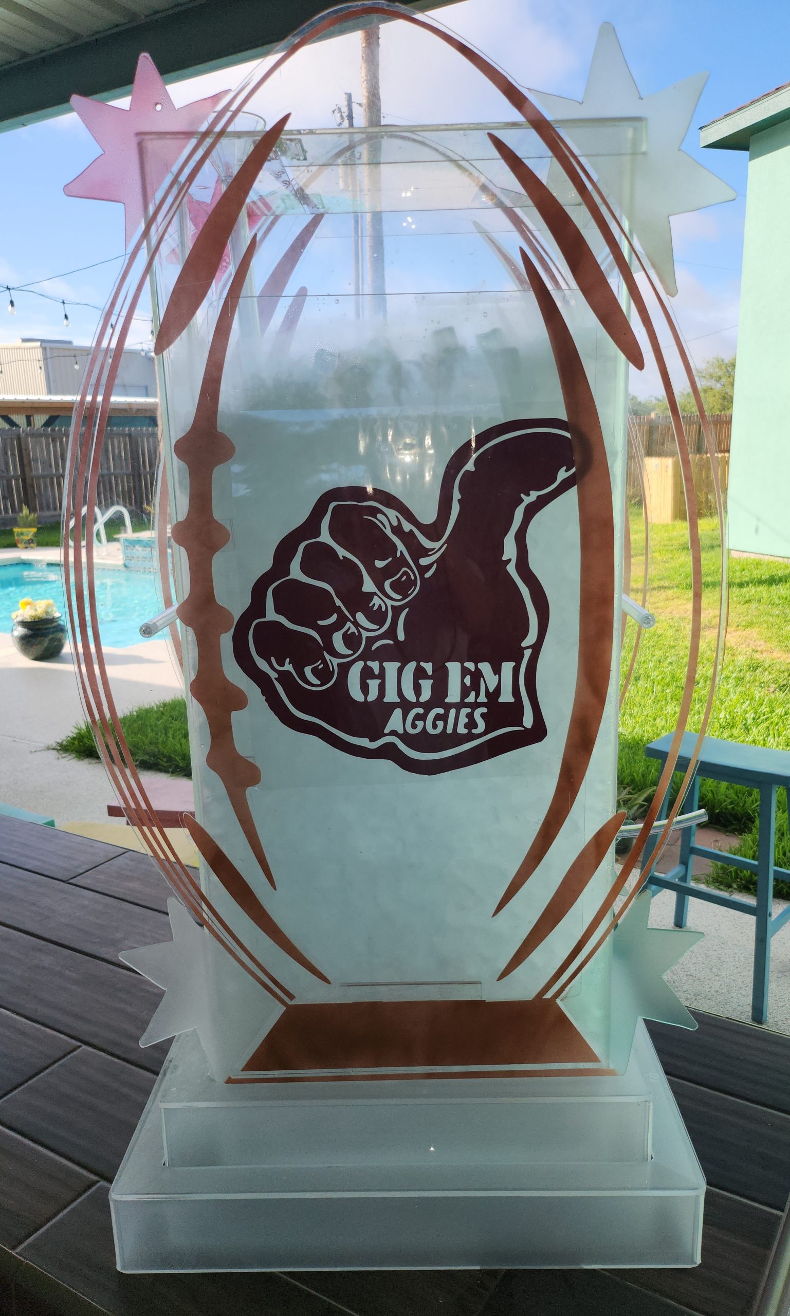 Booze-Block is made from 1/4 inch clear cast acrylic and has several unique features. Choose from several designs, add a Company logo or Team logo with clear easily removable vinyl decals, fill the main tank with ice and serve up your guest favorite shot. When the ice in the tank begins to melt, simply drain the water and add more ice. There are 2 compartments in the base of the tank, one is for separating the frozen ice from the melted ice and one for adding lights so the entire Booze-Block glows! The main tank stands 36 inches tall and has 2 stabilizer rings at the bottom. The rings not only enhance the design but adds to the stability of Booze-Block. Even when the main tank is filled with ice, Booze-Block is easy to move.